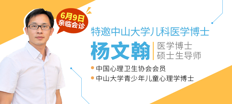 如果您的孩子有以上心理障碍问题,可以直接预约6月9日专家会诊,特邀中山大学儿科医学博士杨文翰亲诊。