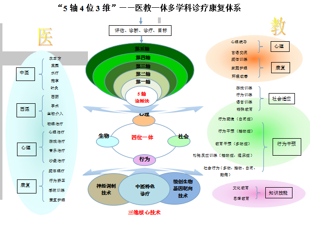 5轴4位3维诊疗康复体系依照“生物—心理—行为—社会”医学模式,集检、测、诊、医、导、训同步进行,以“临床精神行为异常表现、发育和智商水平、生理神经功能诊断、心理社会应激、儿童功能总体状况”5大方面检测定位为五轴检测系统,以“脑神经系统——中枢神经系统——周围性神经系统”3大维度诊断定位为三维治疗系统,从遗传、神经生化异常、大脑结构异常、病前个性特征、环境因素、内分泌等病因机理入手,通过五轴系统检测,三维治疗系统锁定儿童神经系统疾病病因,通过中医学、西医学、分子基因学、现代生物学、免疫机理学、心理学、社会医学、康复医学等多学科临床研究出发,通过神经元靶向治疗,涵盖10大特色技术的诊疗结合,实现前卫的多维干预系统,医教一体,综合诊治,多维度康复训练诊疗康复体系。另外针对疾病诊疗康复的同时,也注重根据现年龄阶段病情做出下一年龄阶段的发展评估,做出防病预前方案,实现最具针对性科学分类、分型诊疗、分层评估、分度治疗儿童神经系统疾病,最终达到有效治疗儿童神经系统疾病。