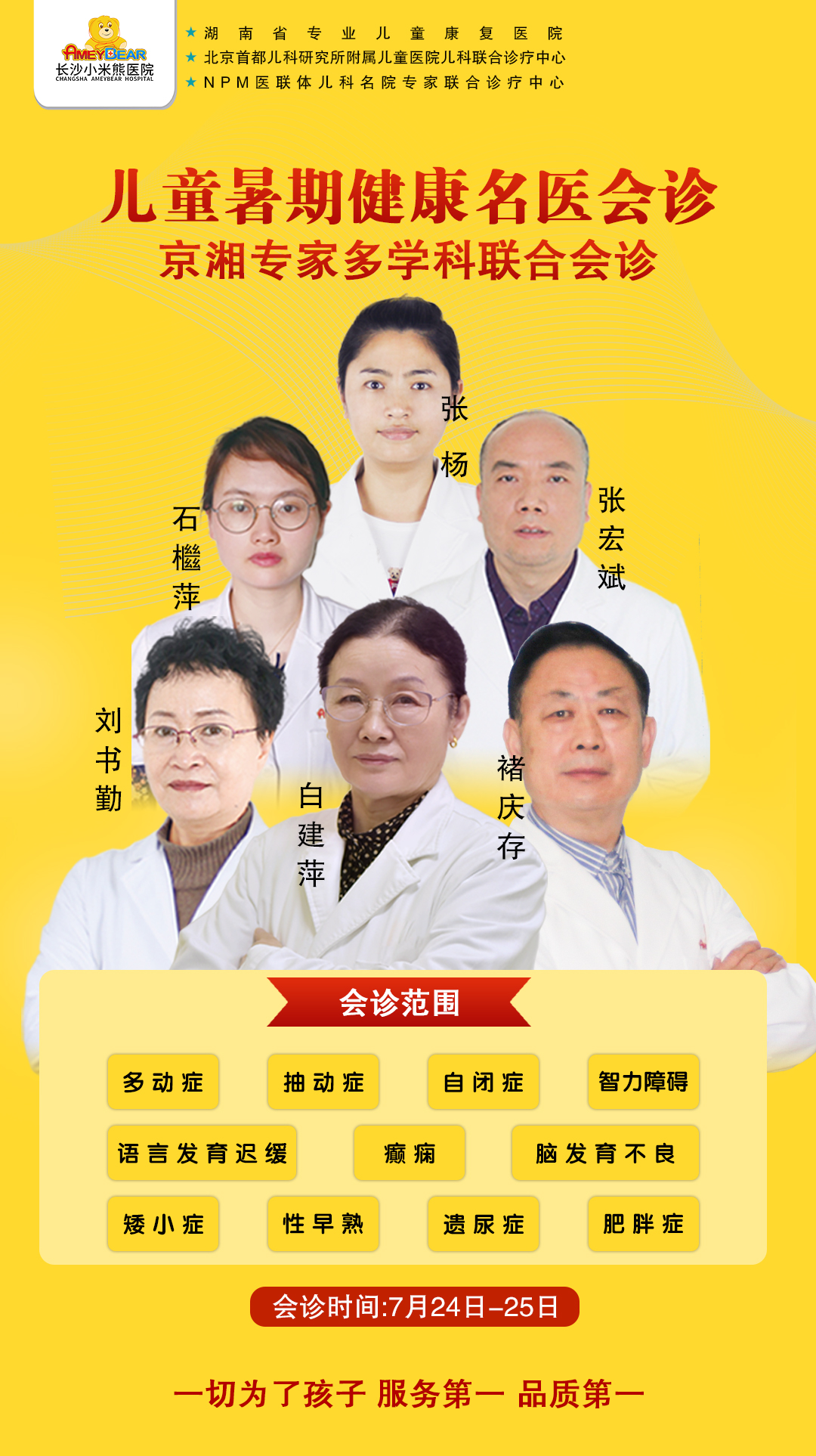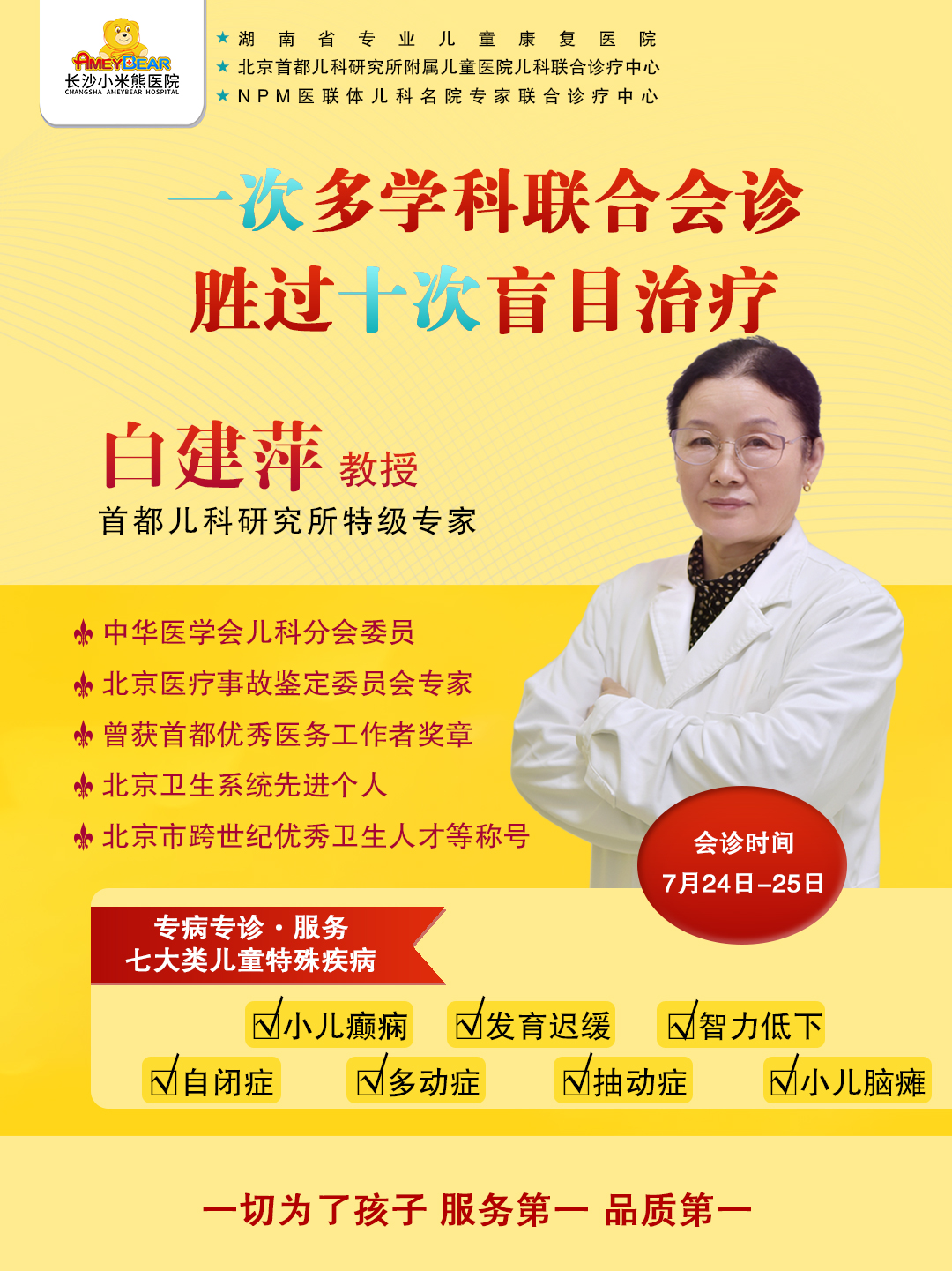 为了帮助这些特殊疾病儿童不出远门、在家门口就能享受到北京三甲名医治疗,7月24-25日,长沙小米熊医院特邀请特级专家白建萍教授携我院专家多学科联合会诊,为患儿排忧解难,让每一位来院患者都能享受到个人专属治疗方案。